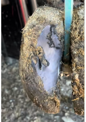 • Small rocks or debris can get wedged into the frog cleft, white line, or sole of the hoof.