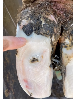 • Check for hoof wall cracks or white line separation that could trap debris.